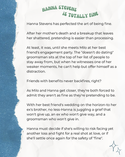 Hanna Stevens has perfected the art of pretending she’s fine—until a “no strings attached” fling with a brooding groomsman threatens to unravel everything. Between her best friend’s upcoming wedding, her ex’s lingering presence, and a grief that won’t quit, Hanna must decide if she’s ready to risk her heart again.