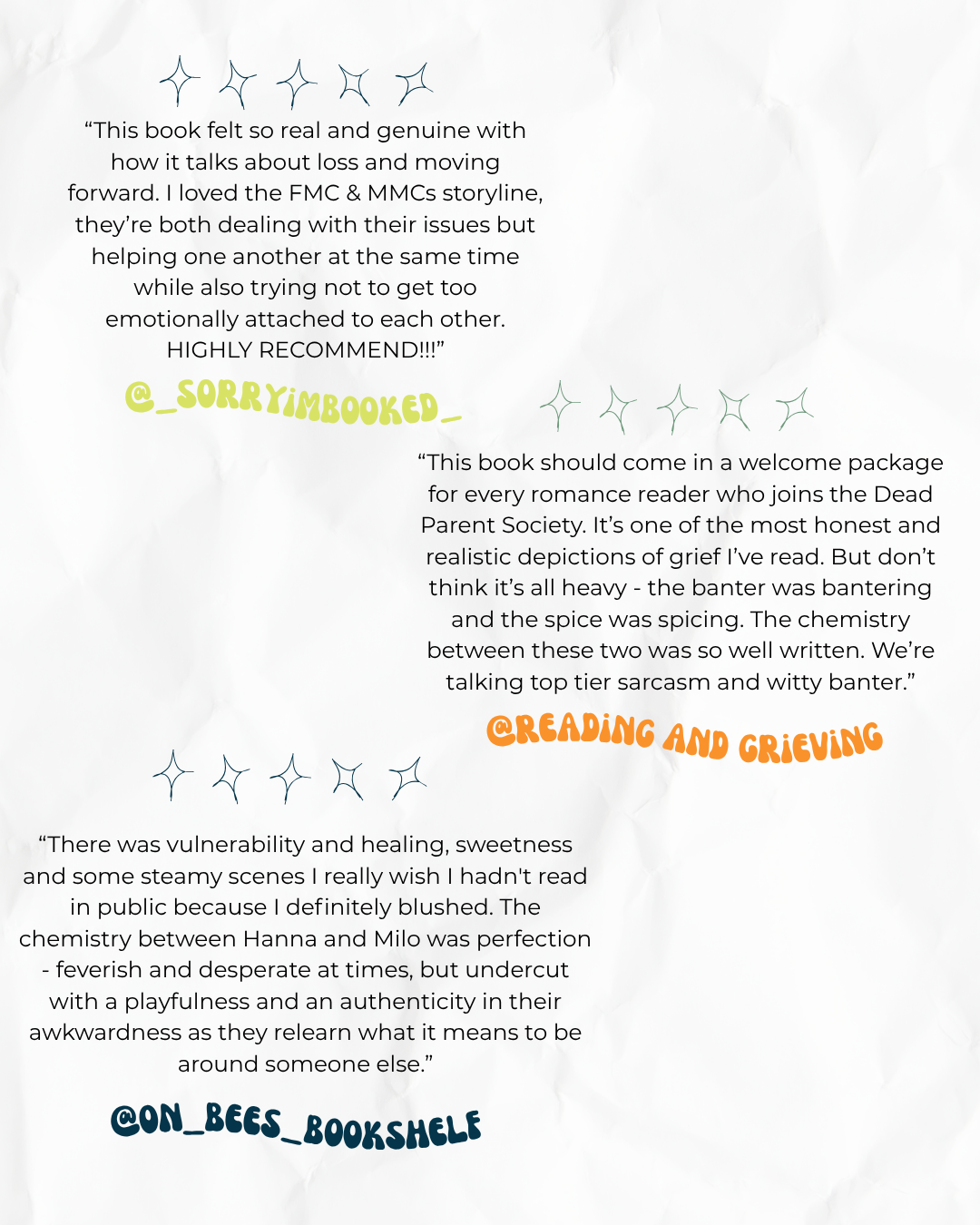 "This book should come in a welcome package for every romance reader who joins the Dead Parent Society. It’s one of the most honest and realistic depictions of grief I’ve read."