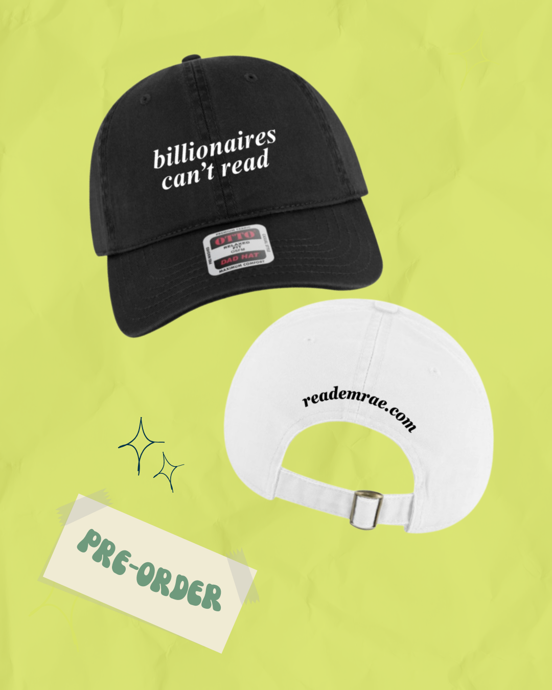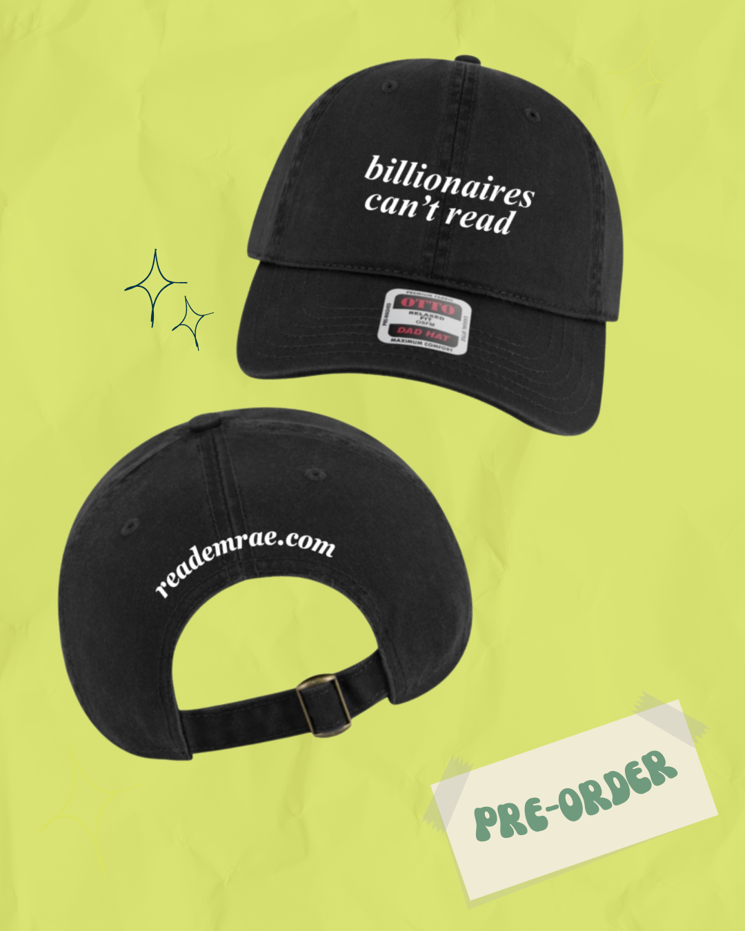 "billionaires can't read" embroidered on front, "reademrae.com" across the back.