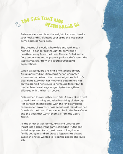 Determined to control her own fate, Astra strikes a deal to wed the charming and rebellious King of Mercury. Her bargain entangles her with the king’s arrogant commander, Luxuros, whose secrets will rain down hell from both the Lunar Court’s enemies in the Solar Court and the gods that watch them all from the Court Above.
